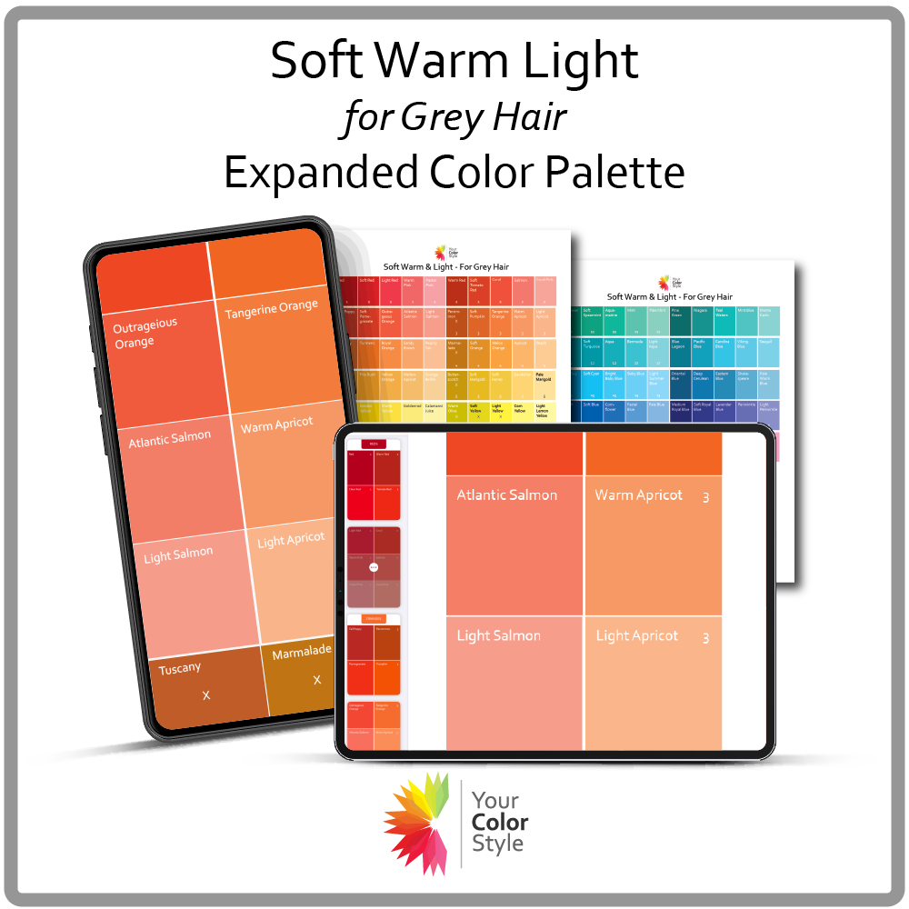 Your expanded digital color palette will show you your complete expanded soft warm light color palette with X's on the colors you may want to avoid. These are colors that may not feel right with your cool gray hair. The Great With Gray ebook is a fantastic resource to learn why certain colors may not feel right and to identify the colors that do flatter your hair.