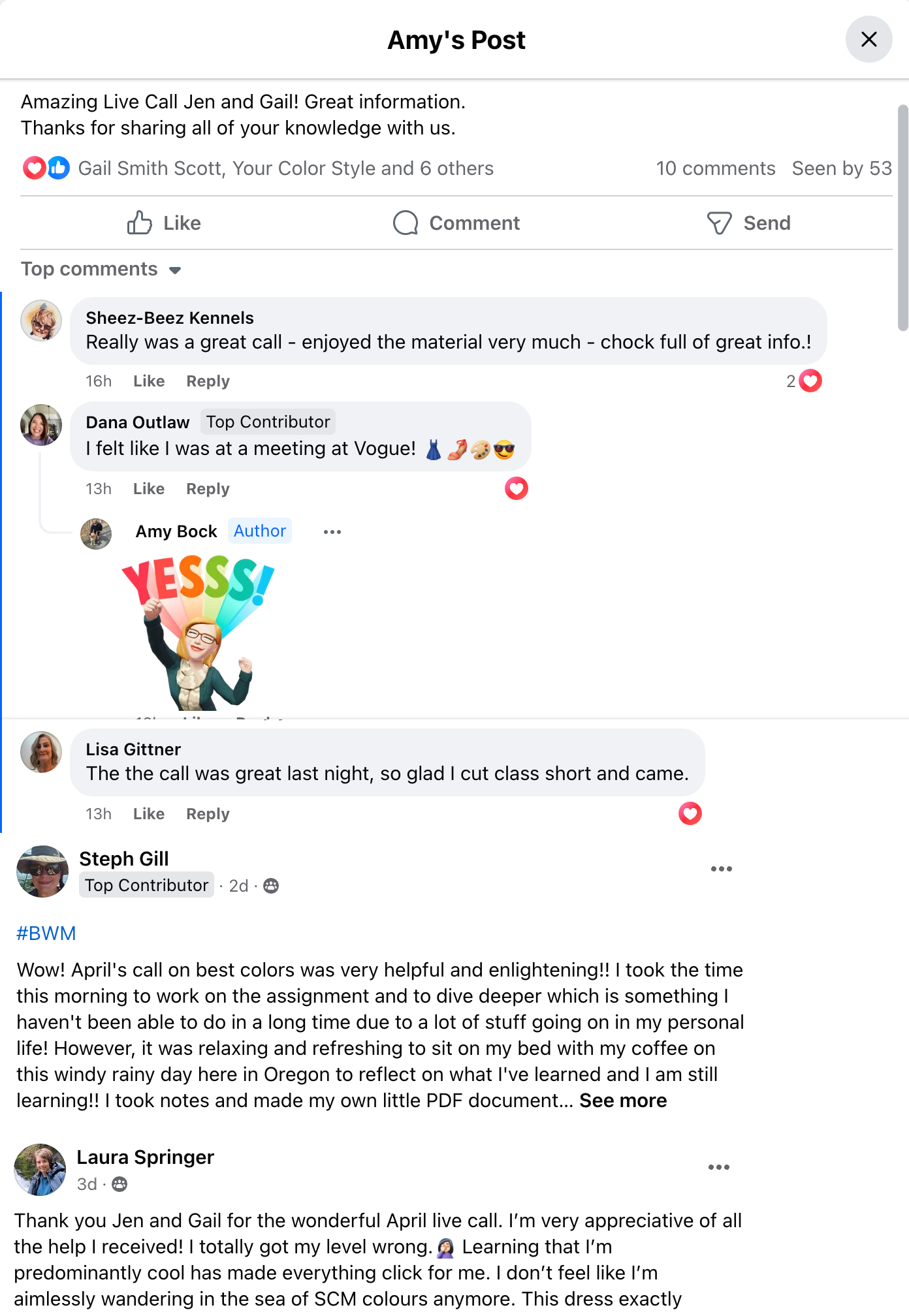 Gail and Jen love to connect with you on our monthly live calls. They over deliver on content. Jen will often request photos from members to perform custom color drapings and suggestions.